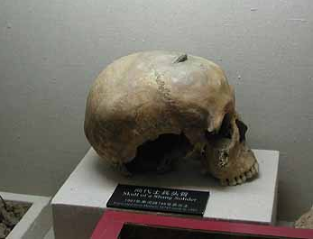 ※出土頭蓋骨に水平断が加えられ冠部の写真が見てみたいところですが、黒崎久仁彦教授によれば「これら生贄人骨の写真およびこれらの人骨に見られた損傷の解析結果については、中国政府の正式な認可を受けてからでなければ発表ができないため、報告書作成現在発表許可申請中である。」ということです