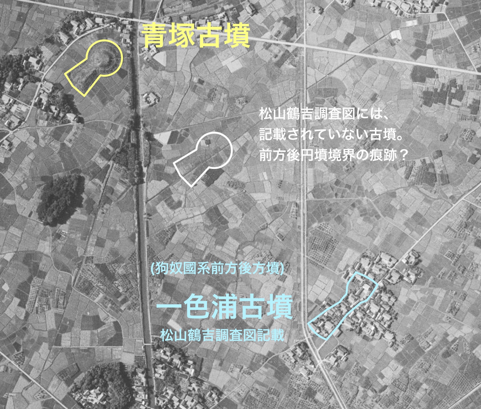昭和36年国土地理院空中写真より、令和8年 記事主作成姫之宮古墳群、姫之宮南古墳群、及び三ツ塚・長塚古墳群
