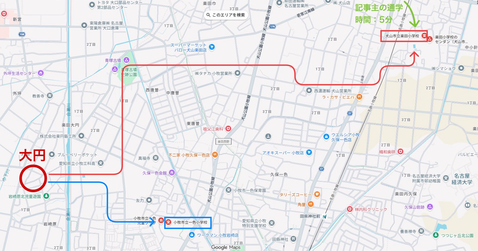 続けて、大正五年の調査図の西端の亀塚について検討します。この集落は大円(だいえん)といって、楽田村の西の端にあります。記事主は前からこの集落が気になっていました。というのはここから徒歩で小学校まで通う同級もいたからです。