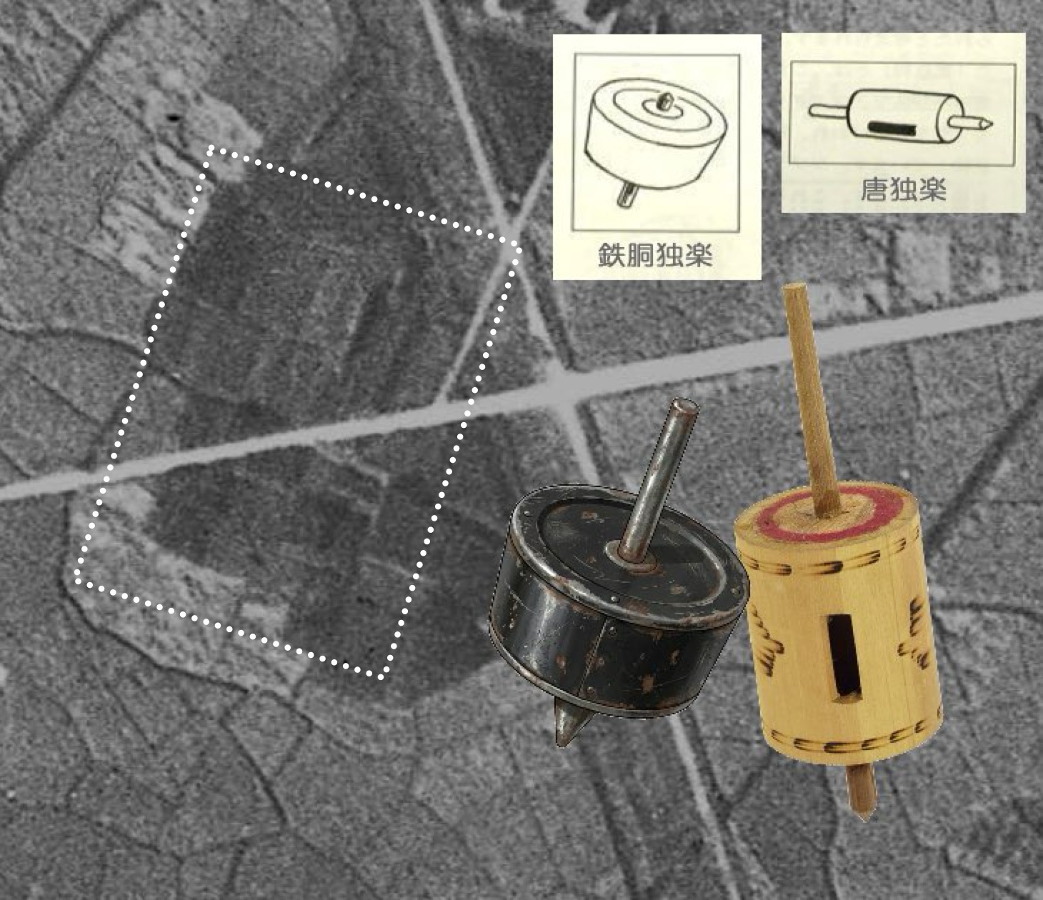 そのような限られた知見のなか、「コマ塚」という表現によって、単純化・記号化することにより、「四角い後方部」と「長細い前方部」の形状を既存の語彙力を使って写し取り、第三者に伝えようとする松山鶴吉の意図が読み取れます。当時誰にとっても馴染みのある「独楽(コマ)」に例える単純化の技術により、学術用語がないハンデを克服しています。また複雑な測量図面を共有できない大正時代において、「コマのような形」という記号化は、第三者の脳内に瞬時に共通のイメージを形成させる強力なツールといえました。