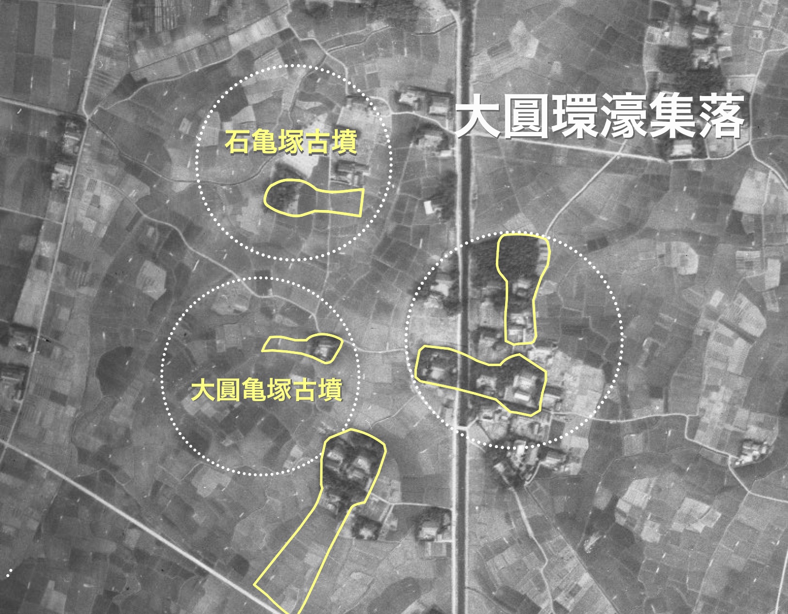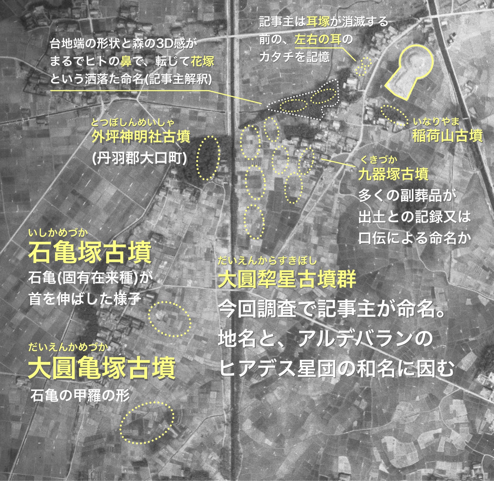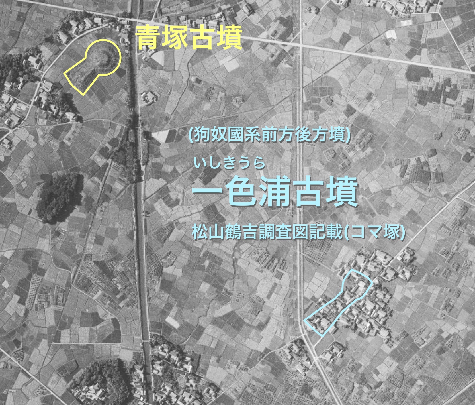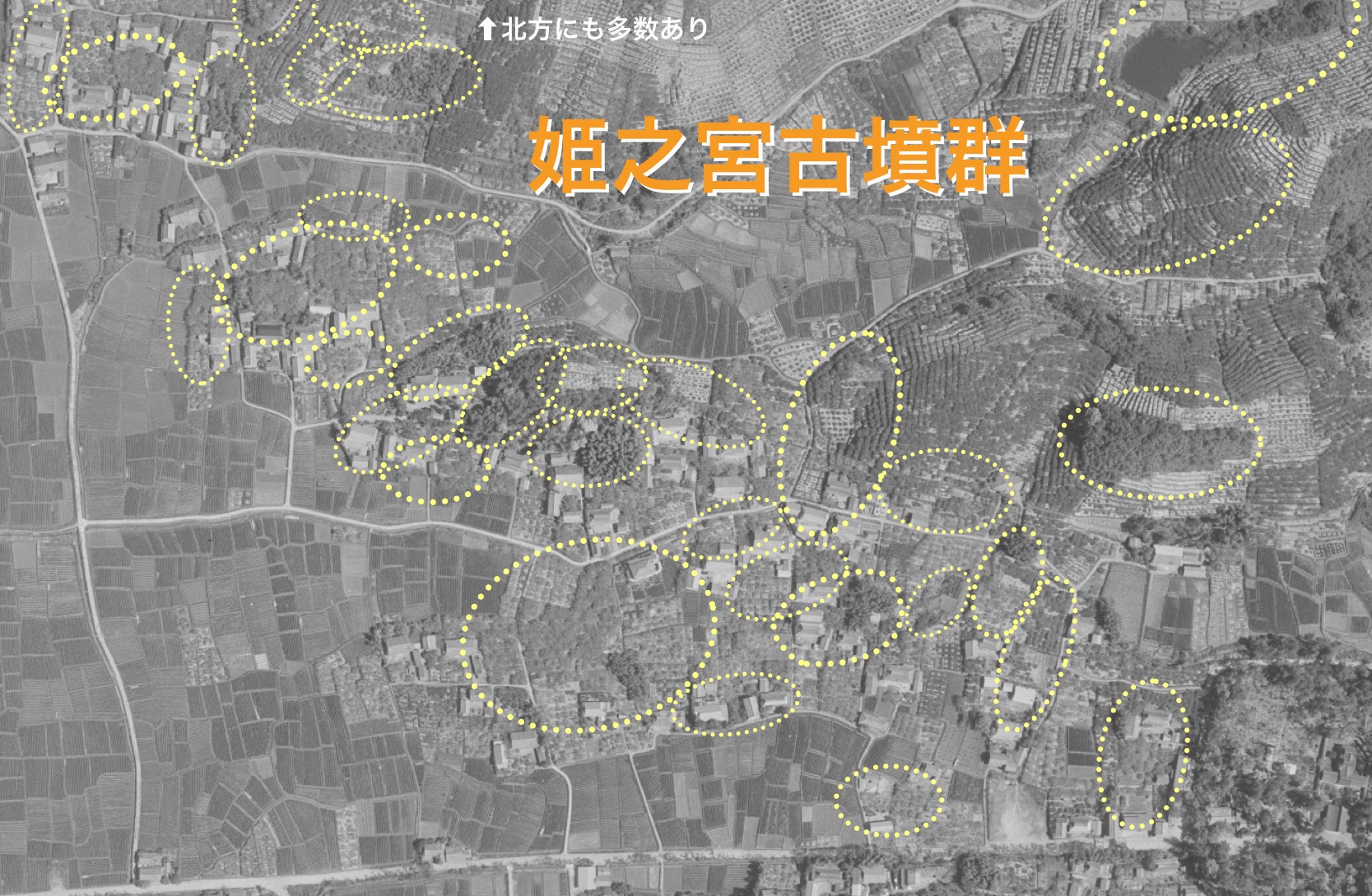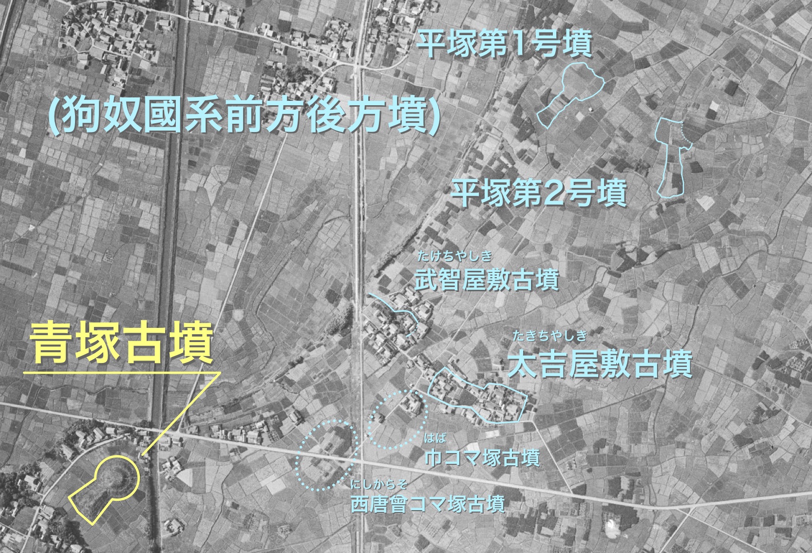 昭和36年国土地理院空中写真より、令和8年 記事主作成姫之宮古墳群、奥宮古墳群、及び三ツ塚・長塚古墳群。