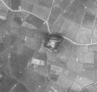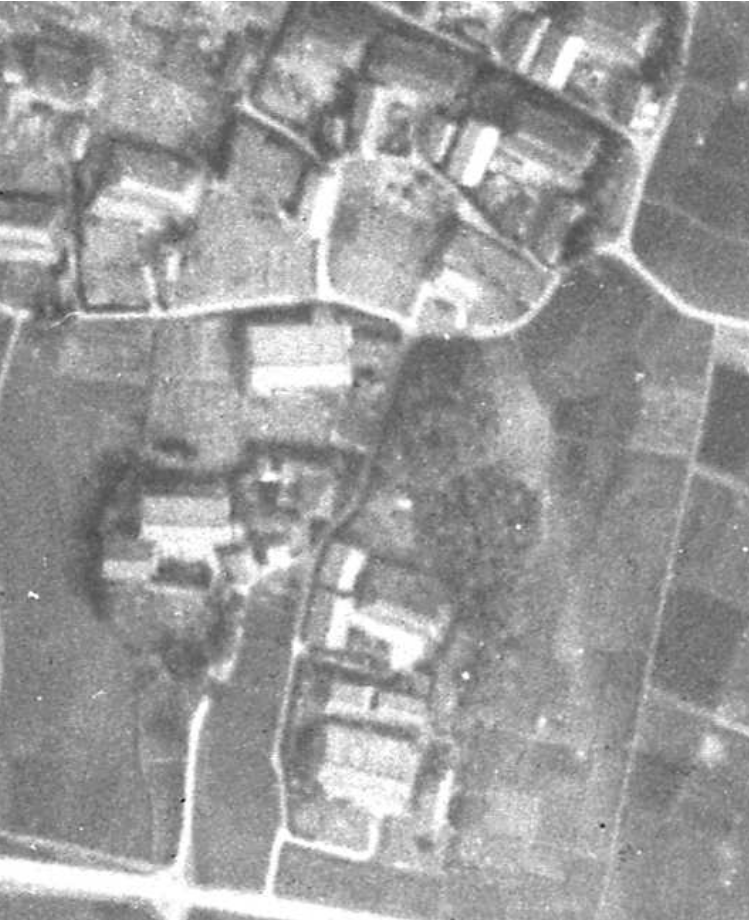 次に楽田城小城址の旧陸軍撮影の空中写真です。お城の北側にうっすらと小城が確認できます。楽田城址および、小城が空撮された、最古の写真と思われます。