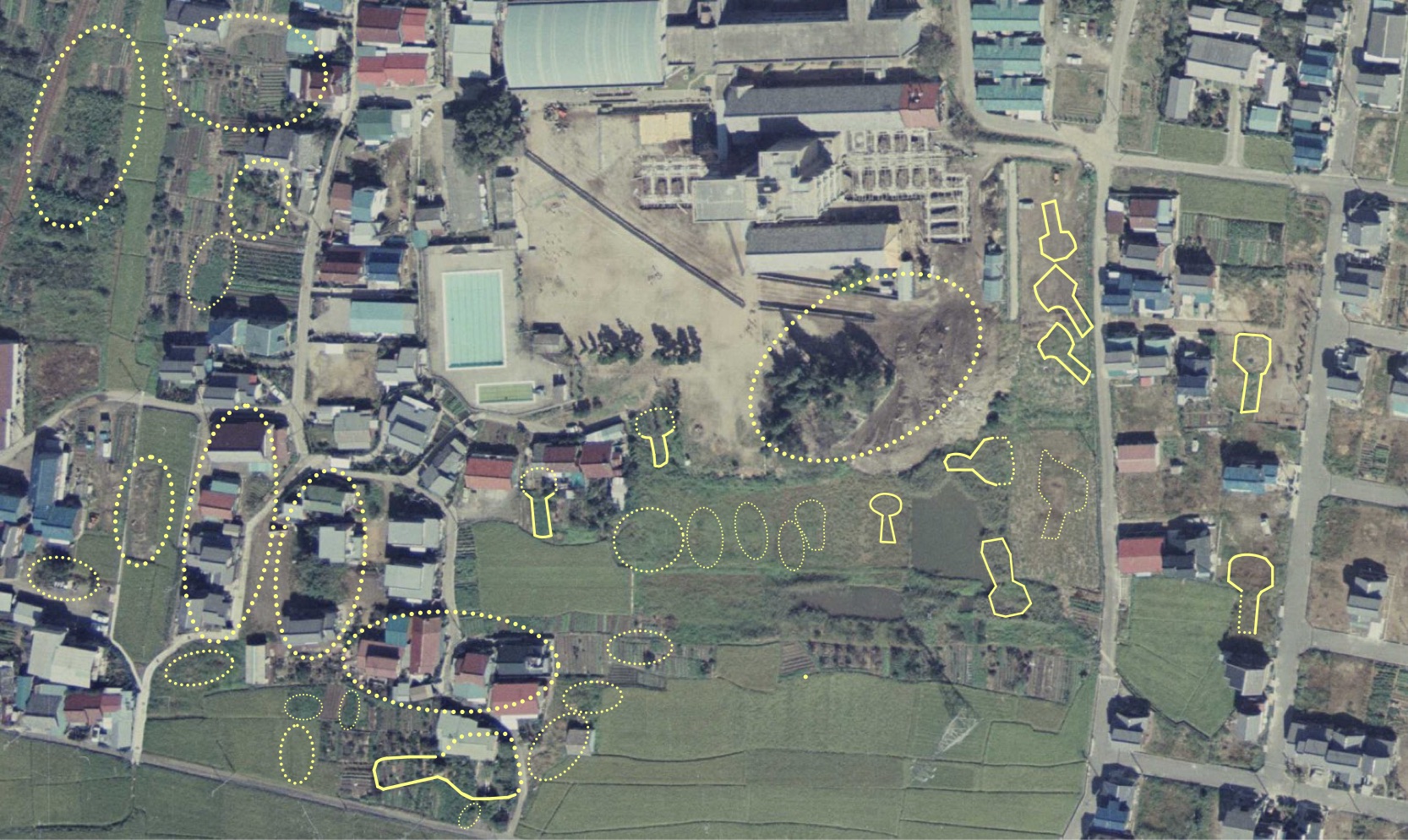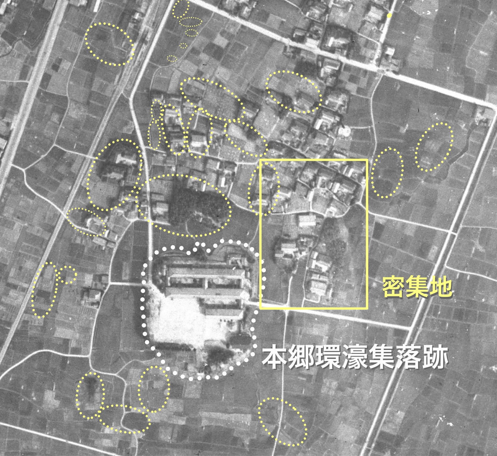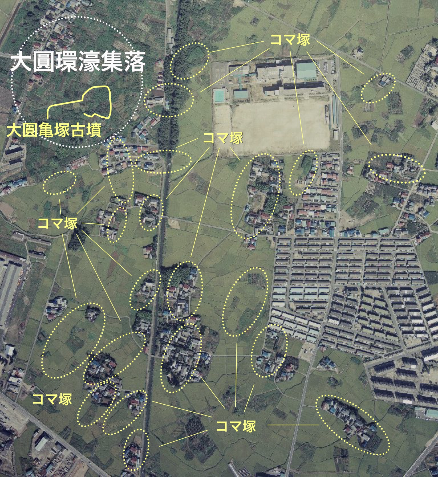大円第1と、東隣の第2環濠集落の南側にも、たくさんのコマ塚と、小型の環濠集落を見つけることができました。(第2環濠集落は図が煩雑になるので円形を省略してあります)