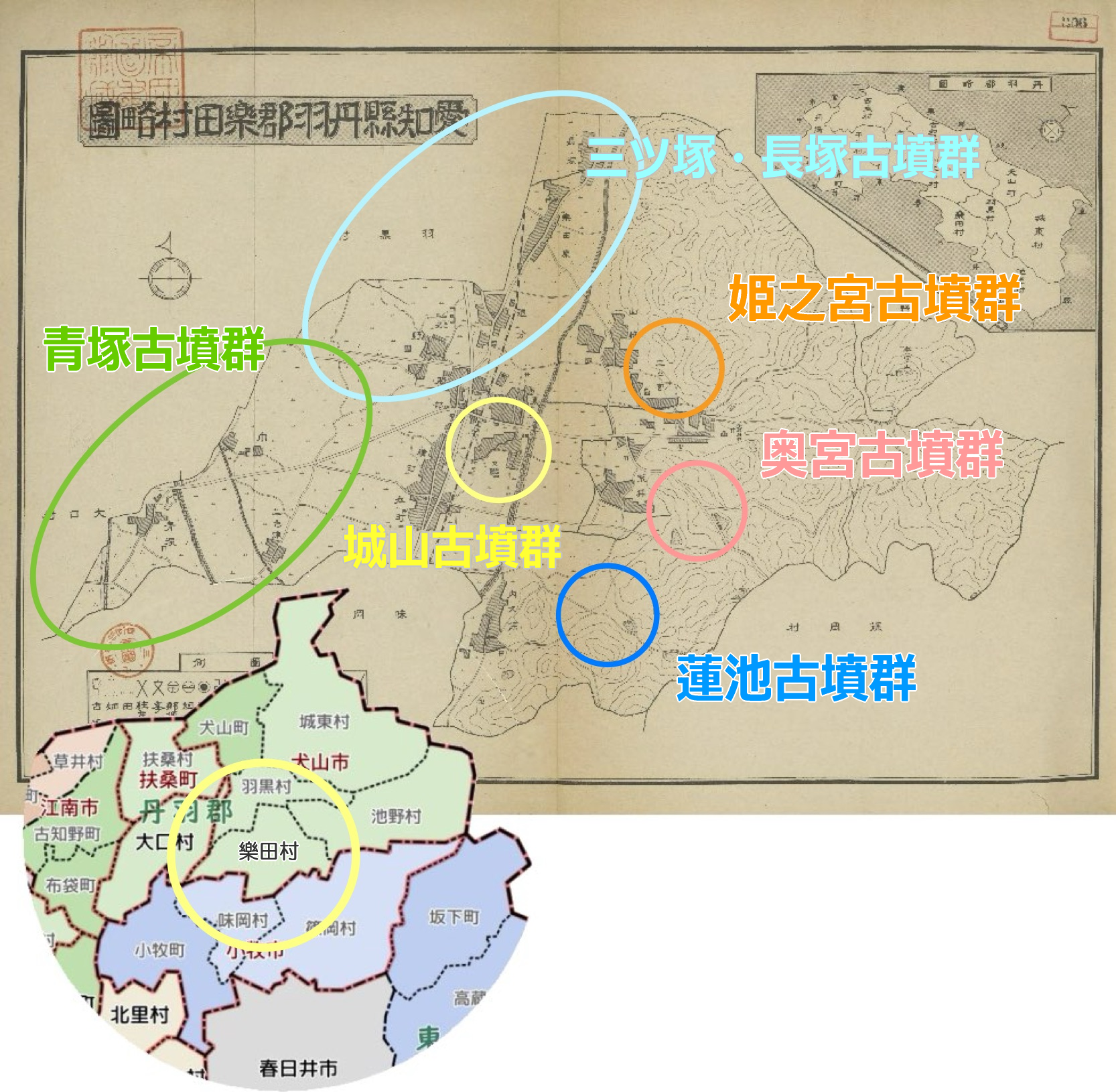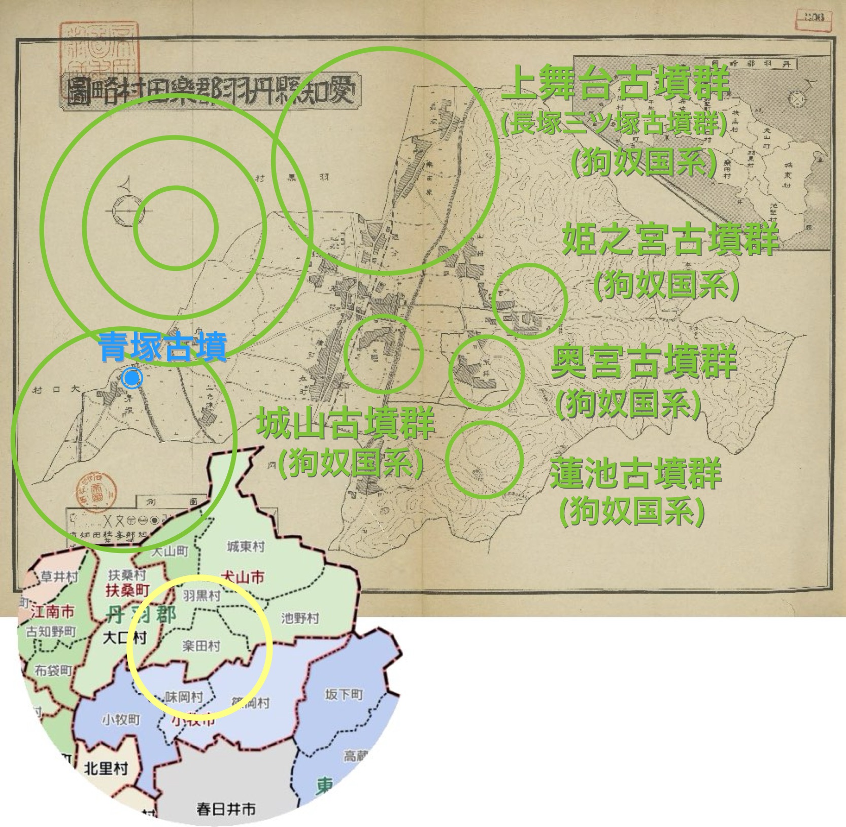 すべての始まりは大正5年、記事主の曾祖父による青塚附近古墳分布圖(以下、調査図)でした。調査図を基に、楽田村の古墳群を検証するうちに、邪馬台国論争に終止符を打つ可能性を秘めた狗奴国中枢の巨大首長墳が疎明されたことは、「魏志倭人伝」の記述を裏付け、空白の四世紀を解明する考古学史上最大の衝撃の一つと成り得るものです。松山鶴吉(世襲名は松山忠左衛門)の調査がなければ、記事主による発見も有りません。