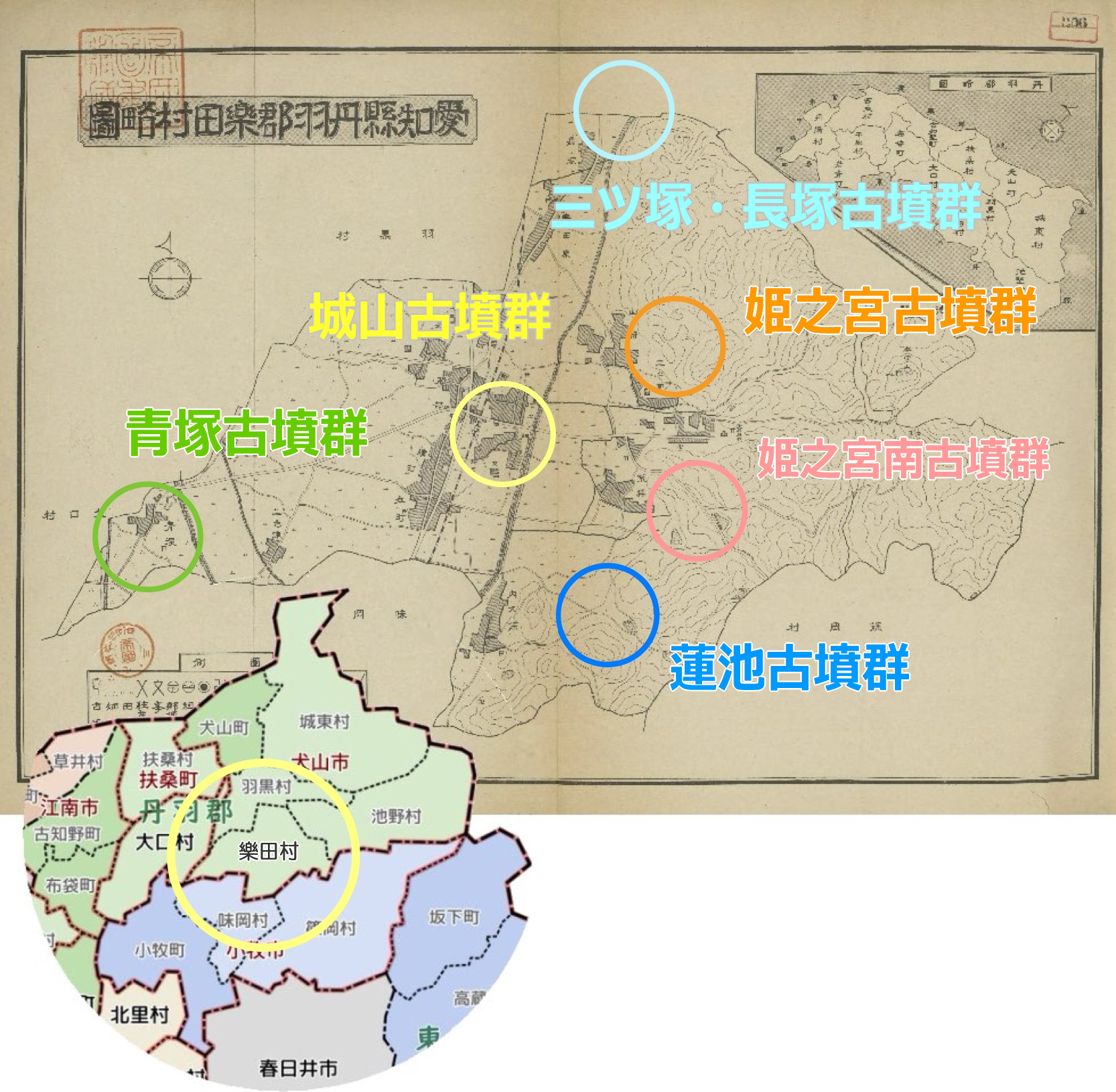 愛知県の楽田村は東日本最大の古墳密集地と記事主は解しています。例えば小牧長久手の戦いで、太閤秀吉の本陣にもなった楽田城の周囲には20基以上の前方後円墳が密集しています。