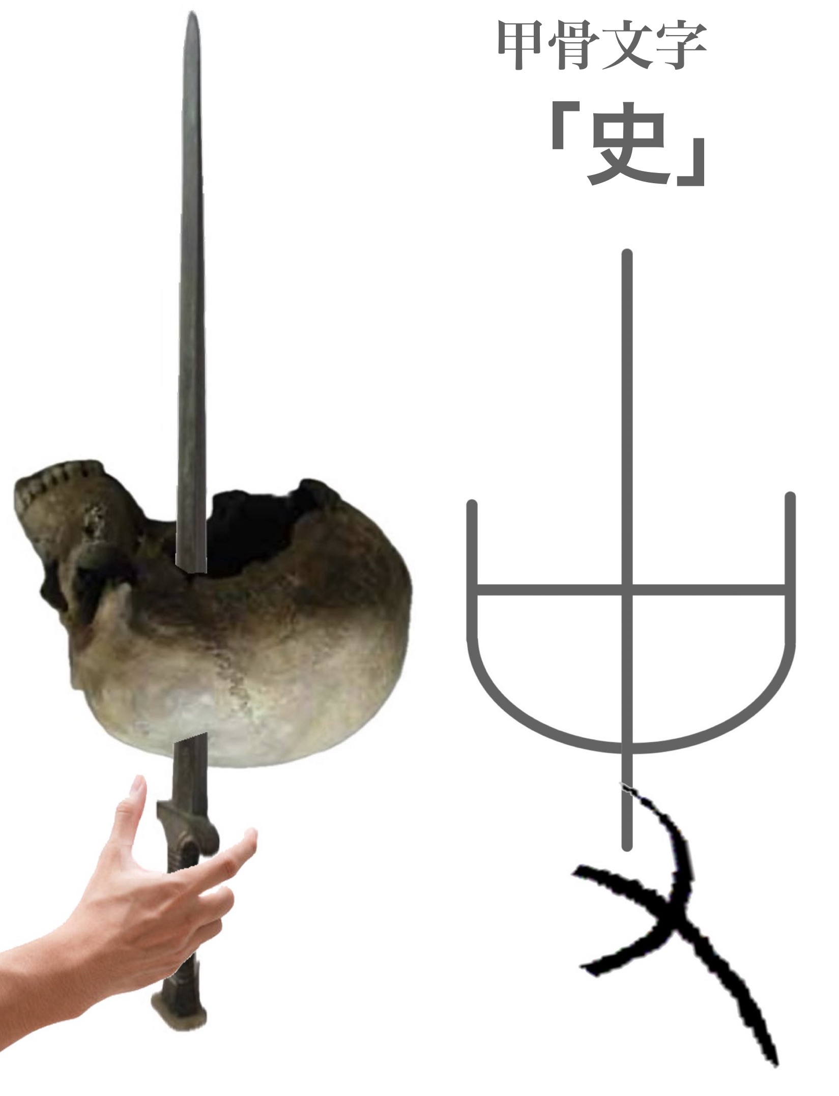 写真の「口」(サイ)に木の枝では強度的にも不自然といえるでしょう。ということで、「史」は「口」(サイ)+刀剣を右手に持った象形と、この記事では解釈します。祭祀による先例旧行を伝統文化として後世に伝え、記録し、保管することが史の始まりでした。