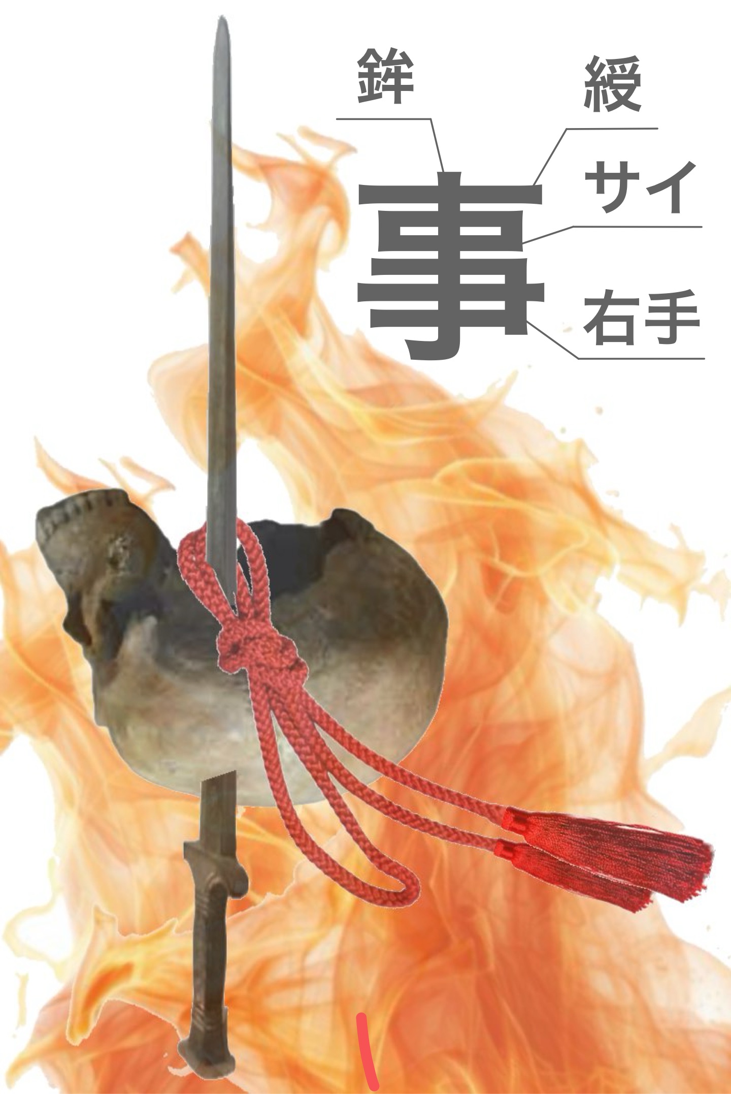 そして漢字「事」は「口」(サイ)+刀剣に綬を付け、右手に持った象形と、この記事では解釈します。外祭は政治的支配を意味し、特にユーラシア大陸のバトルロワイアルな地勢的特徴とあいまって、刀剣+頭蓋骨+綬というのは、王事・政事の意となりました。恐怖を他民族に植え付けることで防壁と成し、余計な争い、戦役を避けるための示威行為と解します。何百という刀剣+頭蓋骨+綬を並べ立てて行進したはずです。要するに「事」とは、古代の軍事パレードのようなもので、ひらたく言えば「マウントを取る」です。3300年前も今も、人類がやってることは本質的に変わらないといえます。