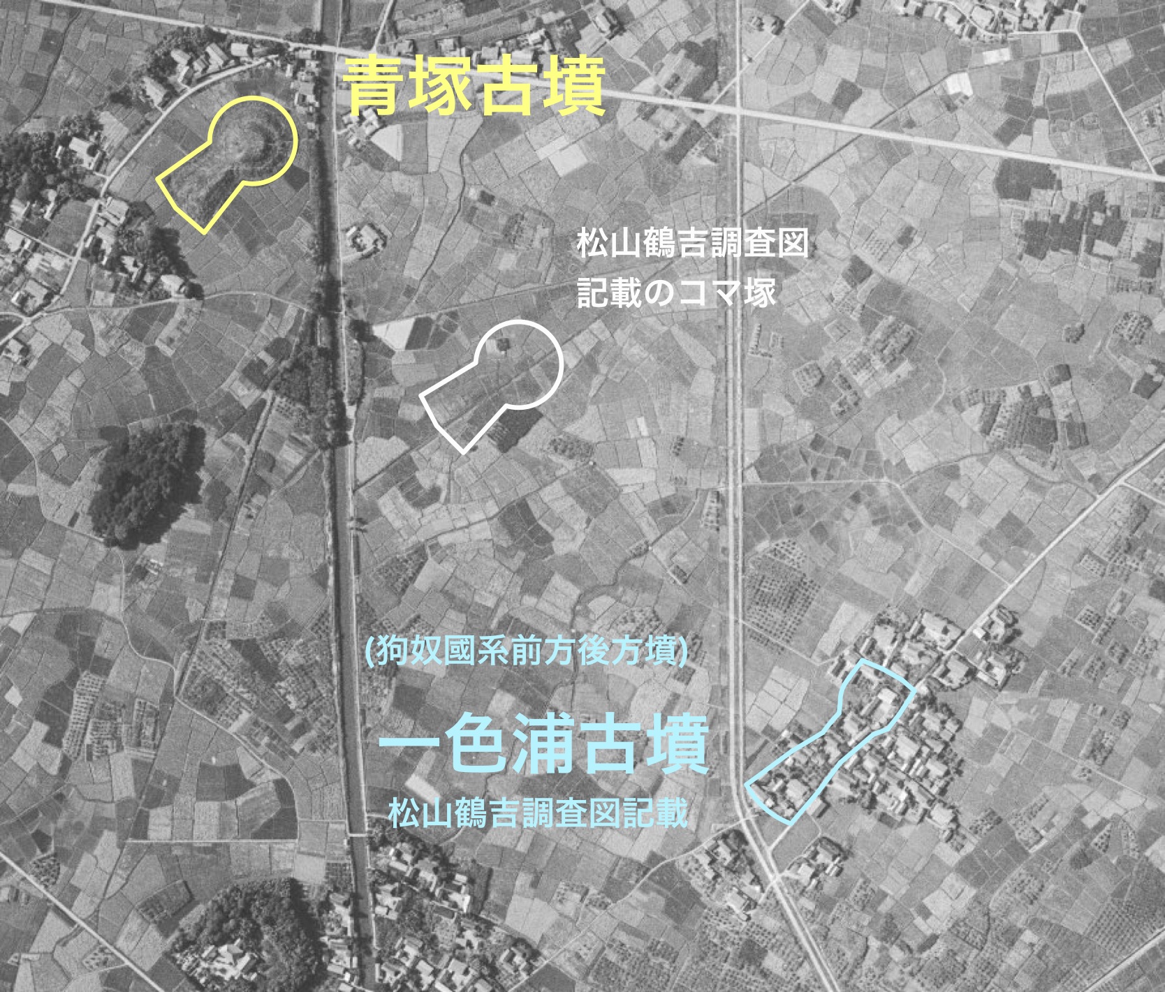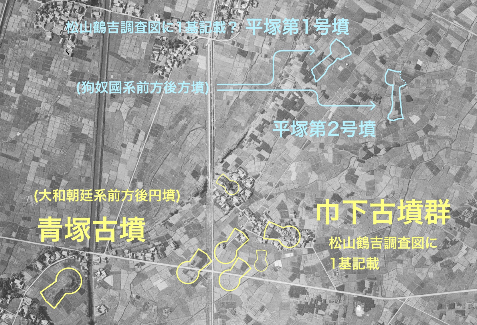 ※平塚古墳群・巾下古墳群・一色浦古墳、これらは記事主による便宜上の呼称です。曾祖父の調査図にならい、すべてまとめて青塚古墳群でOKです。青塚古墳群は青塚以外は全て倍塚(円墳)と解されてきましたが、記事主による検証調査の結果、青塚古墳と同等、または上回る120m~130m級の前方後円墳が複数存在し、狗奴國系の前方後方墳も混在していることがわかりました。