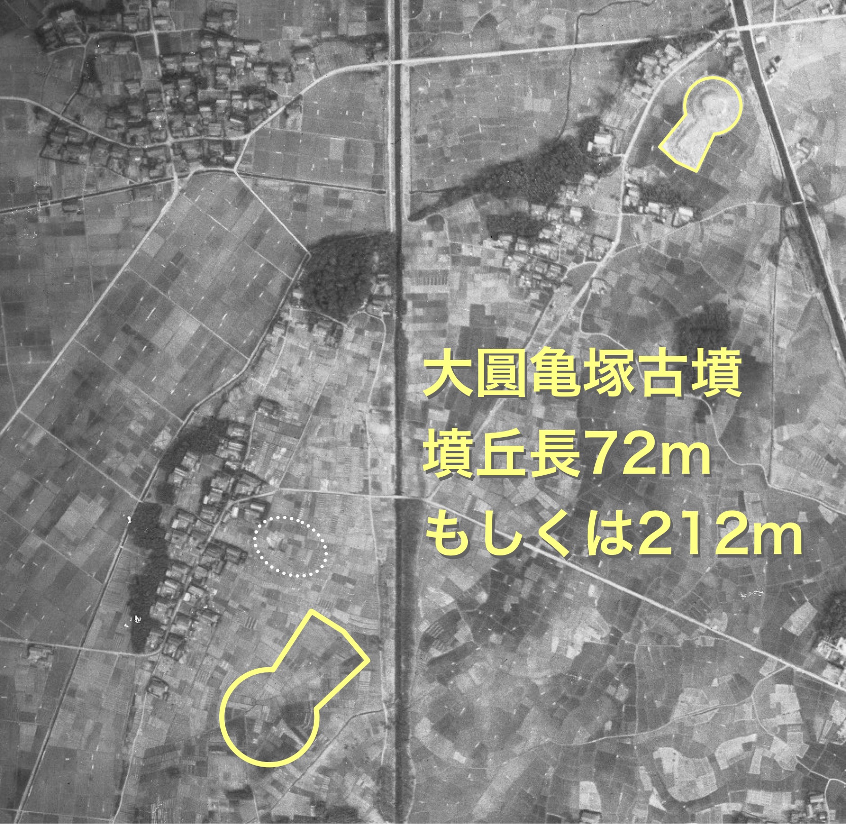 この通り、青塚集落よりも、さらにもっと遠いのです。通学路ですから、最短距離を歩くわけにもいかず、子供の足で1時間半以上かかります。隣の行政区、小牧市の小学校に行った方が余程近いのです。小学生時代の記事主にとっては見たことも聞いたこともない世界が大円なのです。その大円ですが、昭和23年の米軍撮影空中写真で地図で確認すると、狗奴国系の前方後方墳らしきもの(白点線)がありますので、こちらが亀塚になると思いますが、樂田大圓(大円)の地名の由来になったと思われる大きな円形の土地境界も気になります。こちらの前方後円墳の後円部の一部が大正5年当時は痕跡が残っていたとすると、かなりの巨大前方後円墳ということになりますが、現在は耕地整理され、土地境界は完全に失われています。