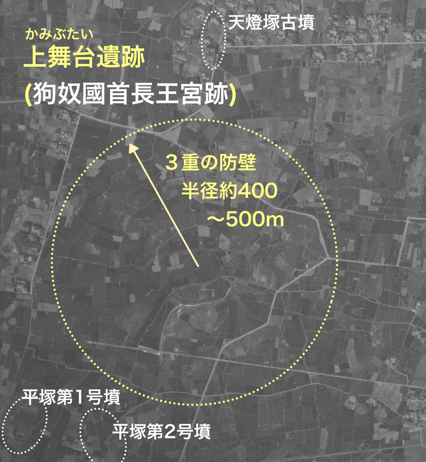 環濠の半径4~500mどころではありません。仁徳天皇御陵級の巨大首長墳上舞台大塚古墳(墳丘長600m以上)も見つかりました。500~600m級の巨大古墳発見となると、1872年の仁徳天皇御陵崩落時に調査に関わった堺の絵師、柏木貨一郎さん以来、154年ぶりということになります。