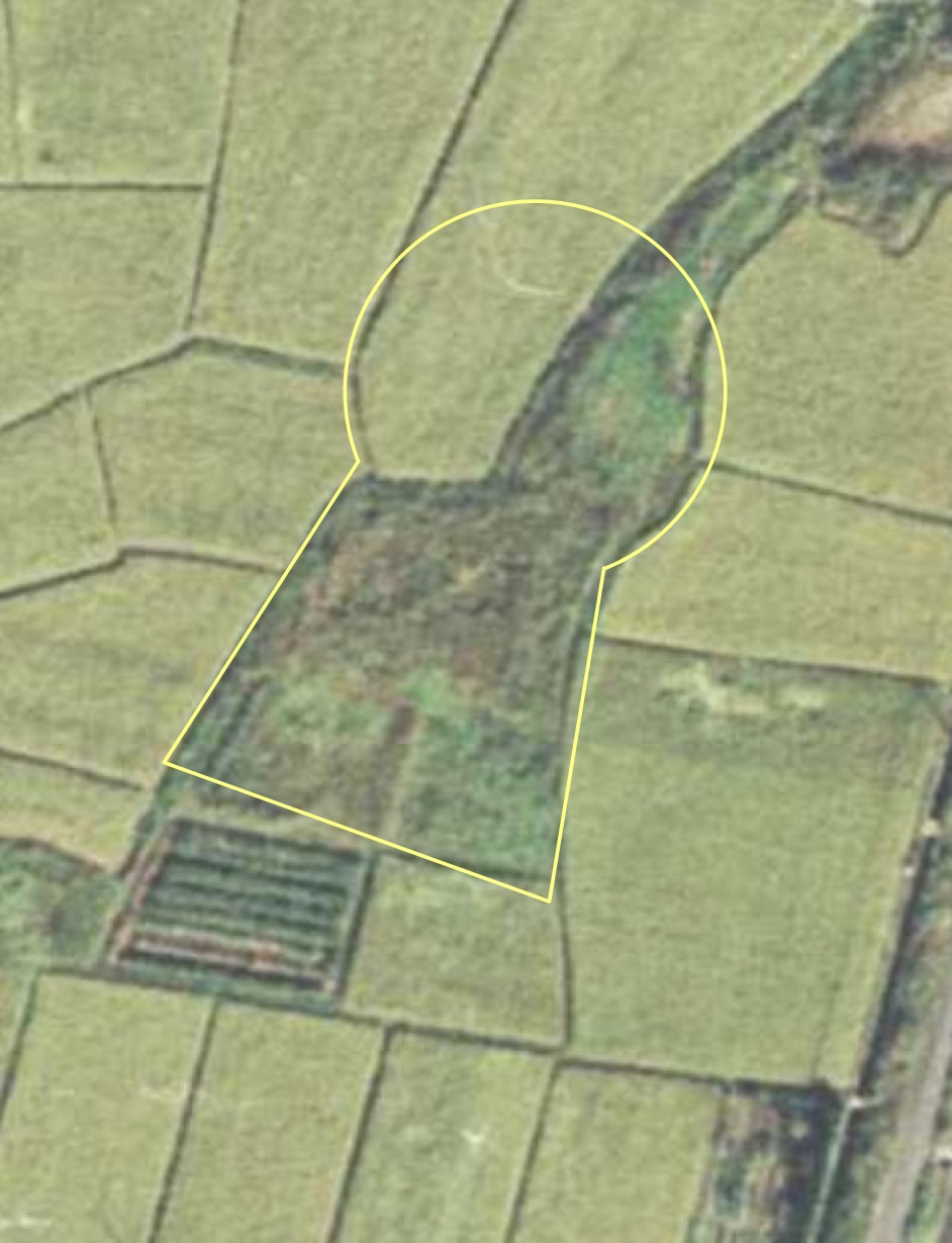 ※土塁の際に引用したものと同じ画像です。左から右一直線に、田圃の真ん中を横切っているのは水路で、今も全く同じ場所、同じ高さを流れています。(白矢印)